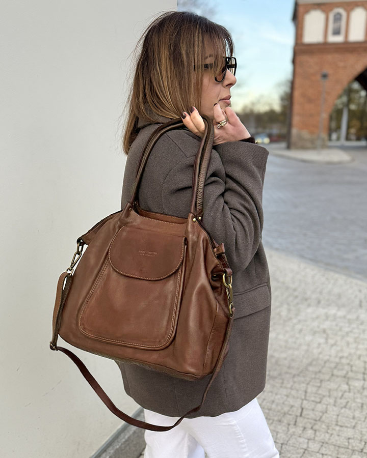 Odkryj niezwykłą torebkę skórzaną typu shopper, która przeniesie Cię w świat natury i jednocześnie zapewni doskonałą funkcjonalność! Ta torebka shopper od MARCO MAZZINI to harmonijne połączenie stylu, jakości i inspiracji naturą. Wykonana z wysokiej jakości skóry naturalnej, ta torba skórzana shopper emanuje luksusem i wytrzymałością. Jej piękny kolor braz camel inspirowany naturalnymi odcieniami zapewnia niepowtarzalny charakter, który przyciąga uwagę. Dzięki przestronnemu wnętrzu i solidnym rączkom, ta torba typu shopper jest doskonałym towarzyszem w codziennych sytuacjach. Pomieści wszystko, czego potrzebujesz, od dokumentów po zakupy, a jednocześnie będzie wygodna w noszeniu. Praktycznie zaprojektowana kieszeń z przodu sprawia że telefon i klucze będą zawsze do dyspozycji na wyciągniecie Twojej dłoni. Dostęp do pojemnego wnętrza torebki zabezpieczony zamkiem. W środku przegroda na zamek dzieląca wnętrze torebki na dwie części. Dodatkowo jedna zamykana kieszeń na dokumenty i jedna otwarta np.: na telefon. Całość wykończona podszewką. Torebka mieści format A4 i dużo dużo więcej. W zestawie długi pasek.