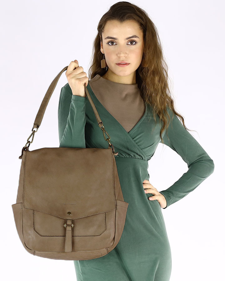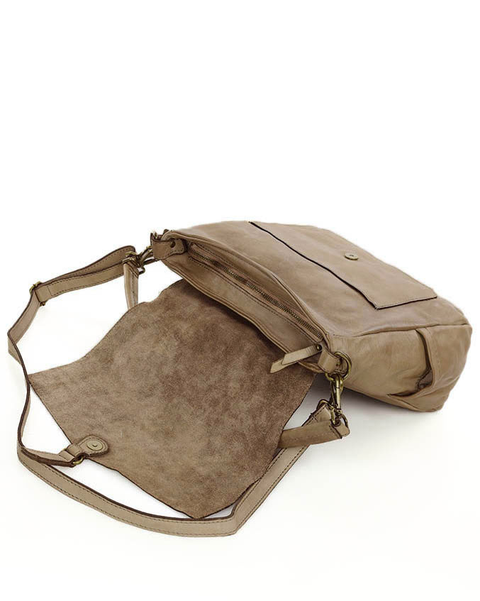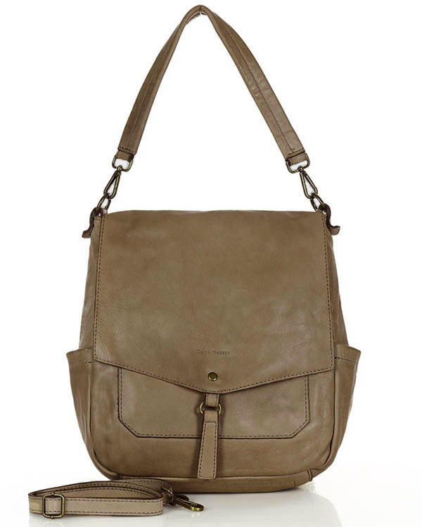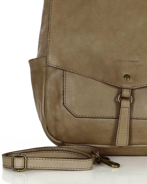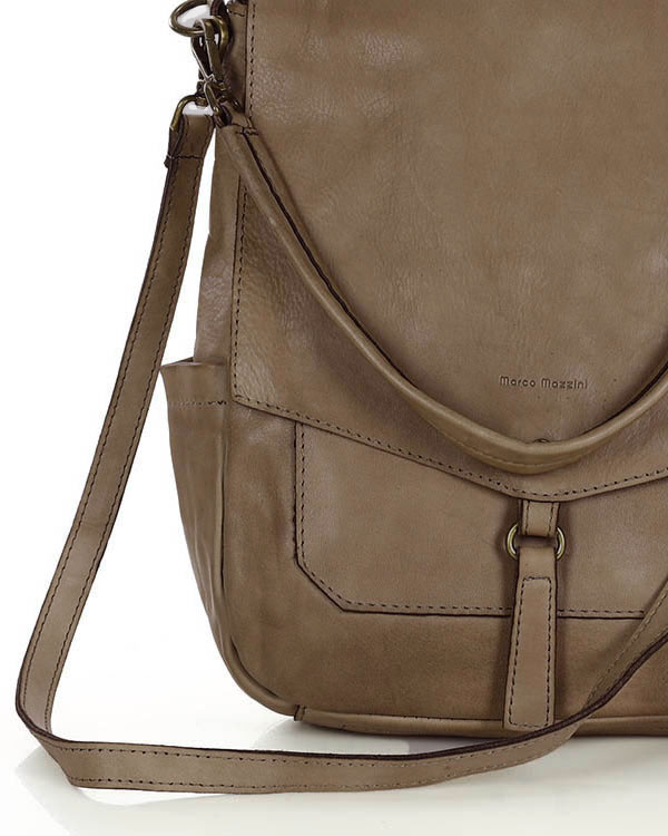 Torebka damska na ramię Marco Mazzini vintage w kolorze beż taupe wykonana została z naturalnej skóry licowej, bydlęcej. Jest to skóra bardzo solidna, wytrzymała na obciążenie oraz wyjątkowo miękka w dotyku. Torebka jest ręcznie szyta i zaplatana, a następnie W CAŁOŚCI poddawana procesom farbowania, starzenia i uszlachetniania. Barwniki użyte do farbowania skóry to wyłącznie barwniki roślinne, nieuczulające i bezpieczne. Skóra naturalna jest materiałem wyjątkowym! Ta wykorzystywana do produkcji toreb Marco Mazzini jest odzyskiwana z przemysłu spożywczego zgodnie z zasadami zero waste.