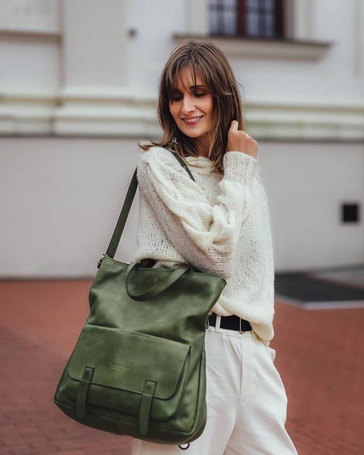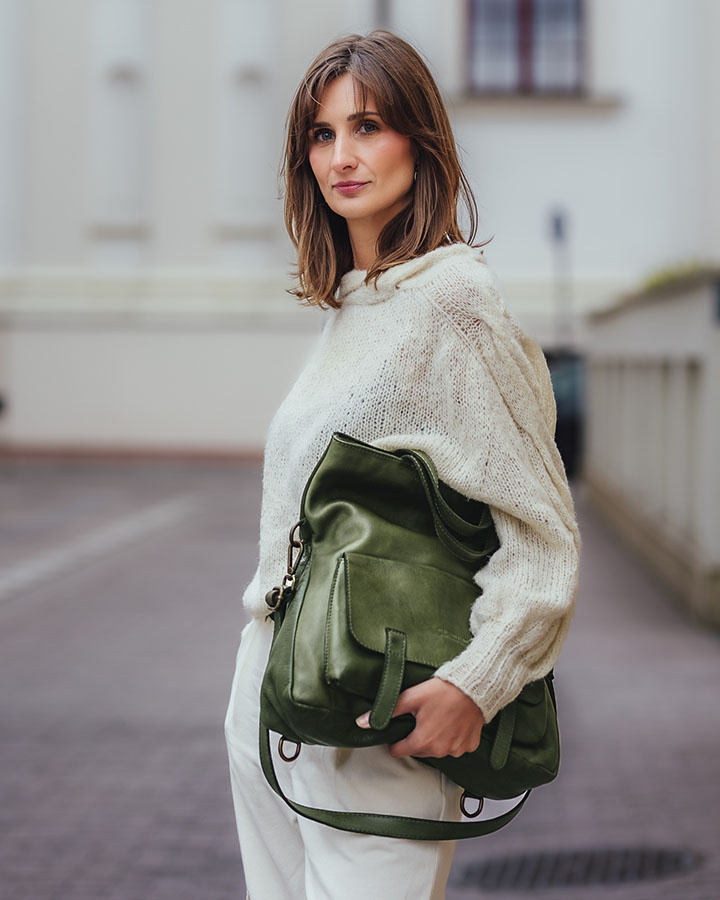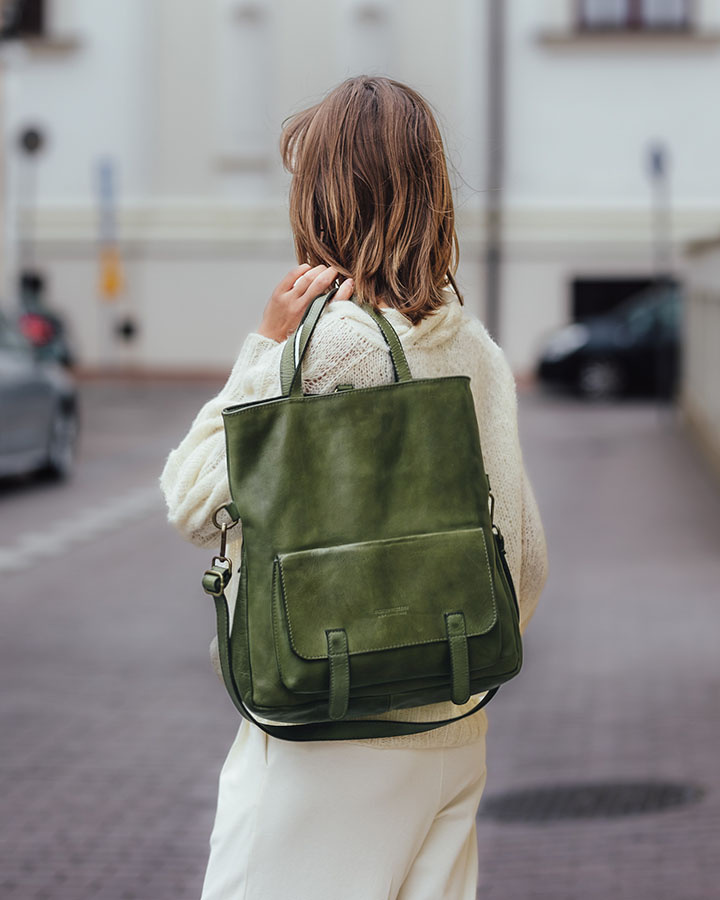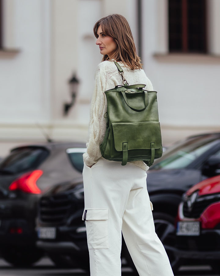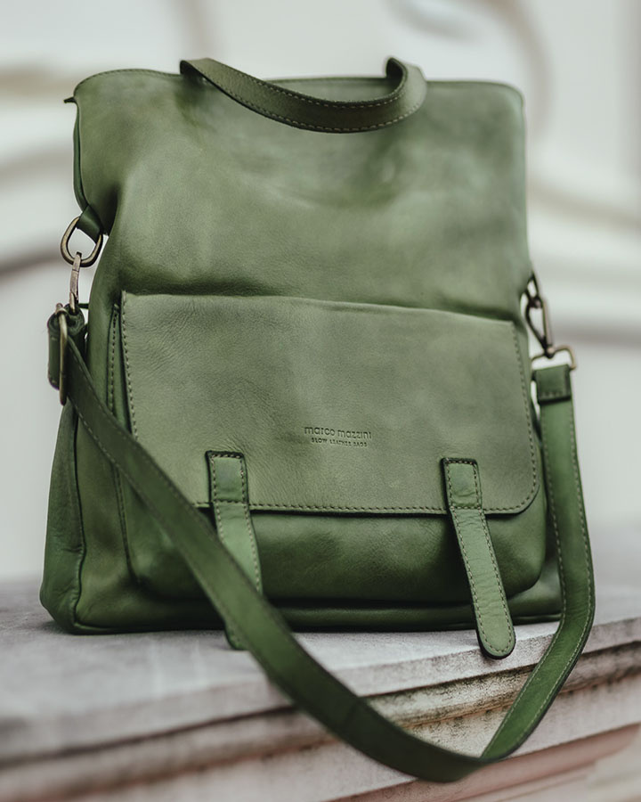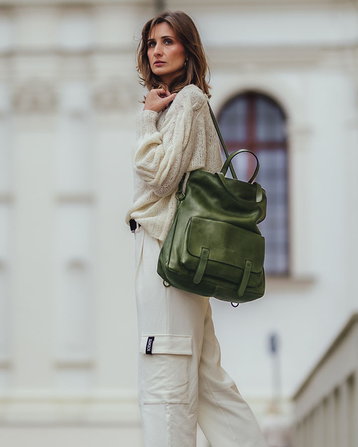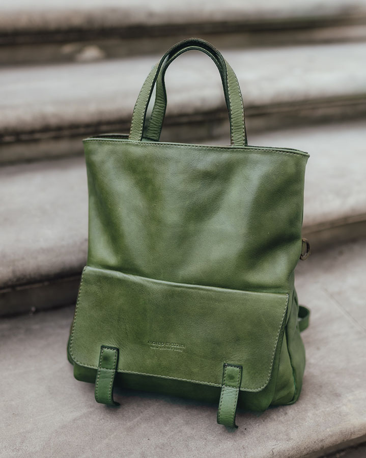 Torebka plecak z kolekcji Marco Mazzini SLOW BAG Runway w kolorze zielonym wykonana jest z naturalnej skóry licowej, bydlęcej, o gładkiej powierzchni. Skóra tego typu charakteryzuje się tym, że jest miękka i aksamitna w dotyku. Torebko plecak jest ręcznie szyty, a następnie w całości farbowany, starzony i uszlachetniany. Procesy te gwarantują długowieczny efekt skóry naturalnej oraz aksamitność w dotyku. Skóra użyta do produkcji jest odporna na obciążenia i niepowtarzalna z wyglądu.