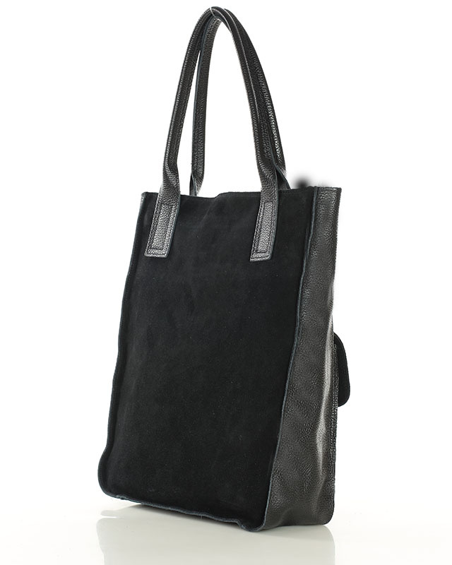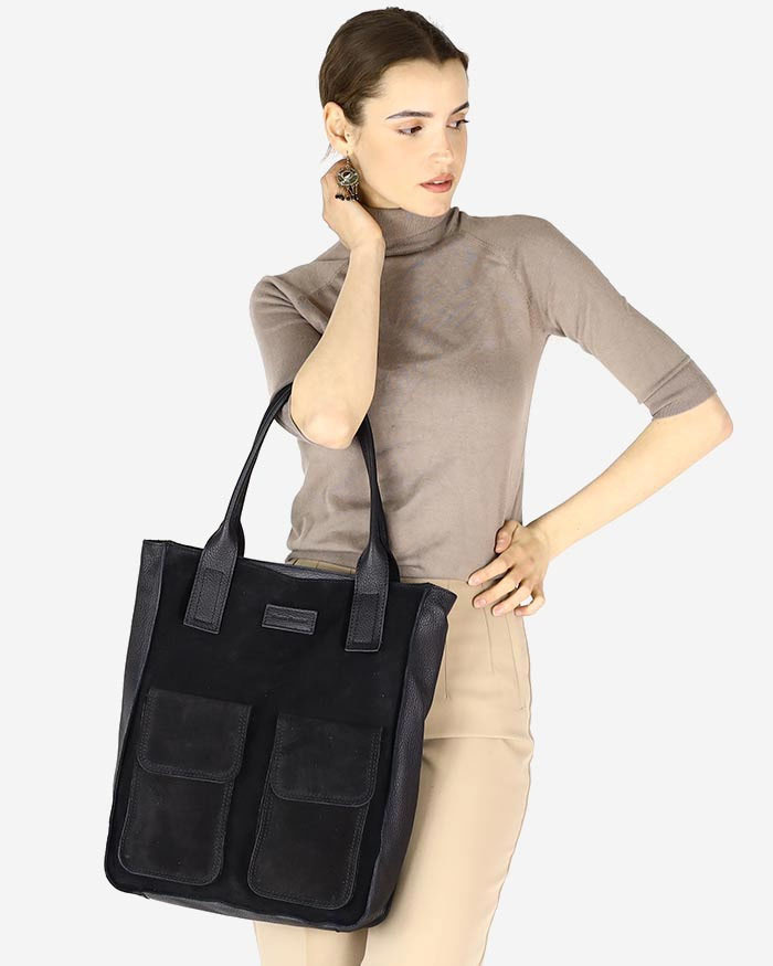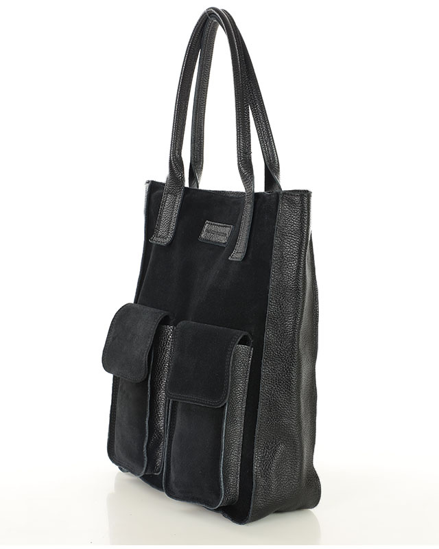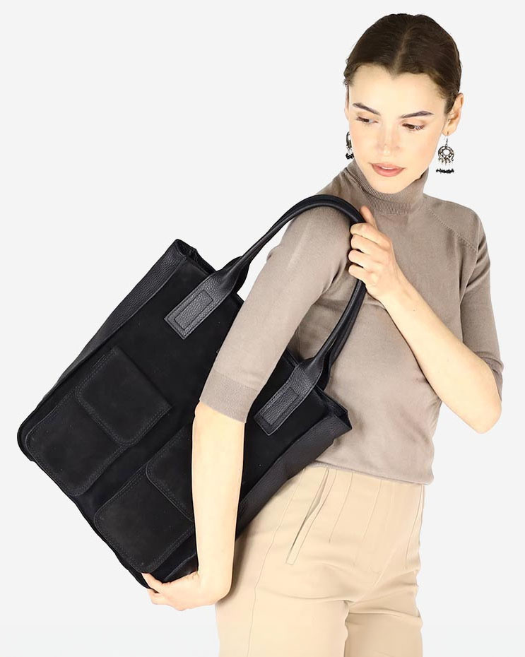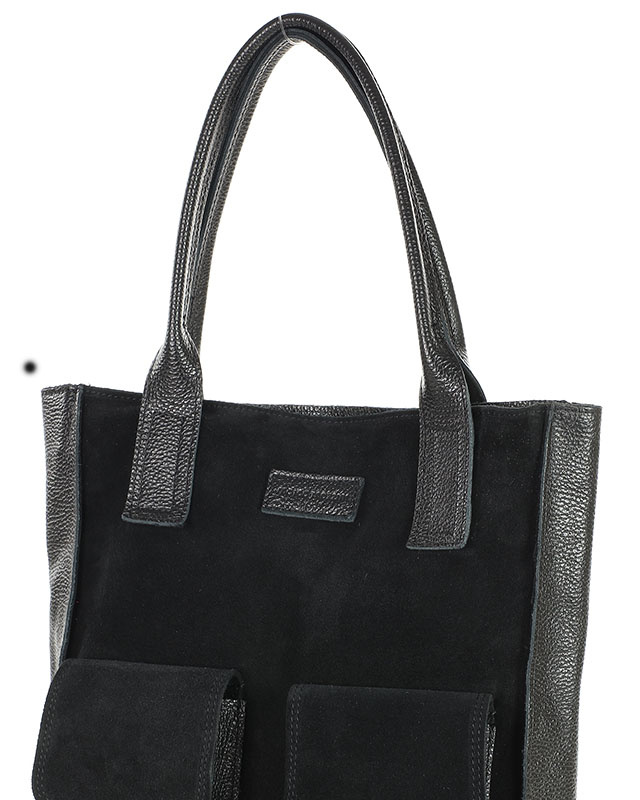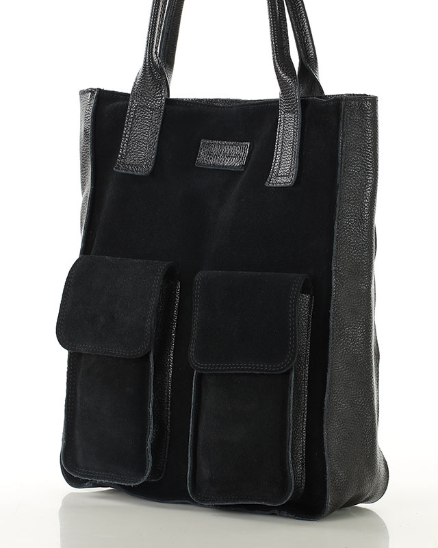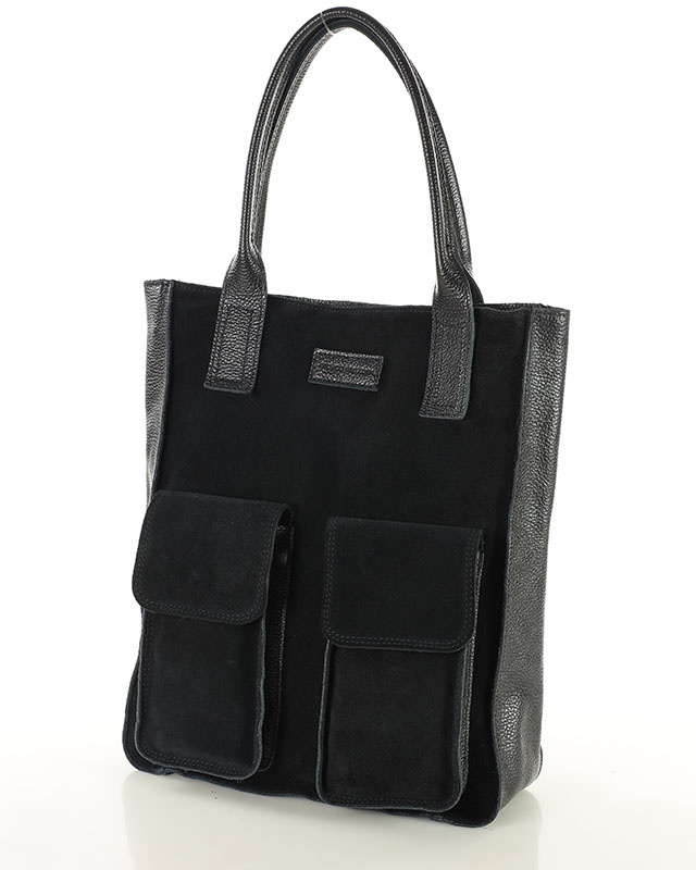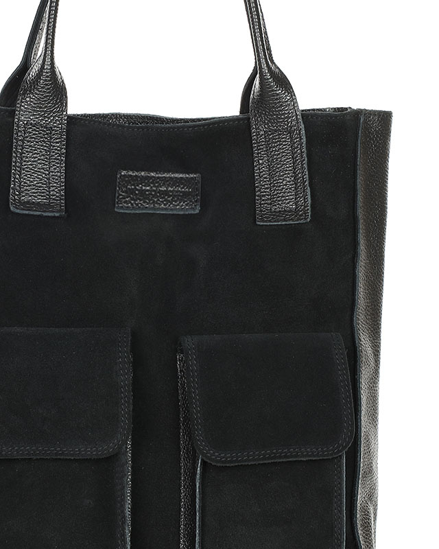 Czarna torebka zamszowa typu shopper bag z kieszeniami