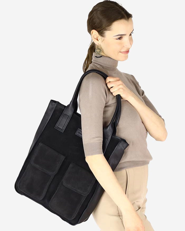 Torebka zamszowa shopper bag z kieszeniami skóra naturalna - MARCO MAZZINI czarny