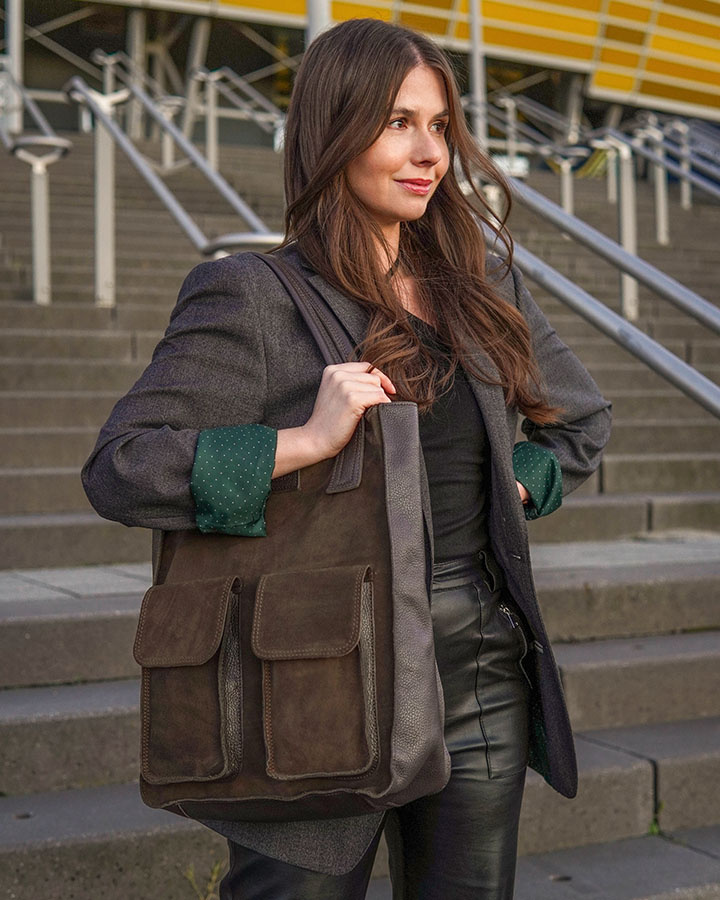 Torebka shopper ciemnobrązowa wykonana jest z dwóch rodzajów skóry naturalnej: zamszowej oraz dollaro. Skóra zamszowa jest miękka i przyjemna w dotyku, ze strukturą delikatnego meszku. Skórę dollaro wyróżnia delikatnie “groszkowa” faktura. Torby damskie z tego materiału są bardzo wytrzymałe na obciążenia i zarysowania, świetnie sprawdzają się więc w codziennym, intensywnym użytkowaniu. Prosty i minimalistyczny fason, w oprawie z solidnej naturalnej skóry, zapewnia komfort użytkowania na najwyższym poziomie. Naturalna skóra to nie tylko bardzo wytrzymały surowiec, ale również doskonale zachowujący swoją formę przez lata.