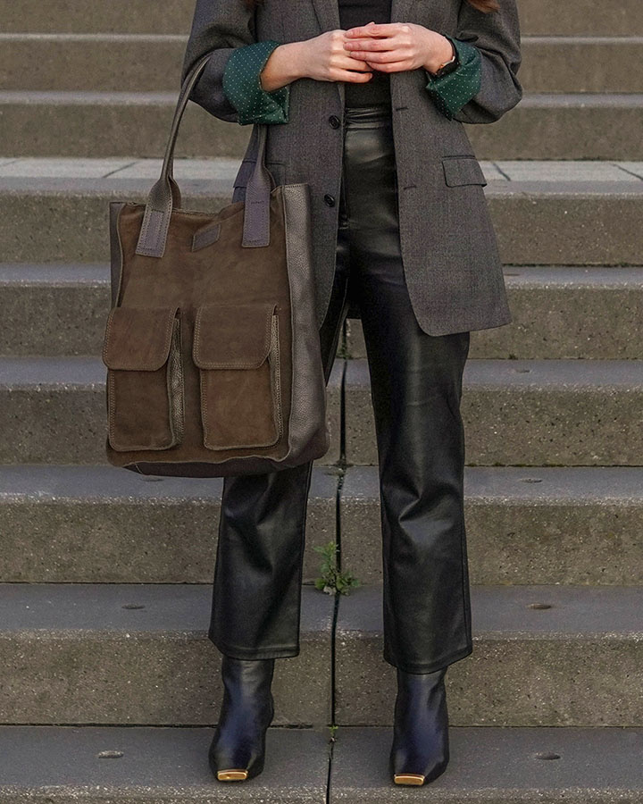Ciemnobrązowa torebka zamszowa typu shopper bag z kieszeniami