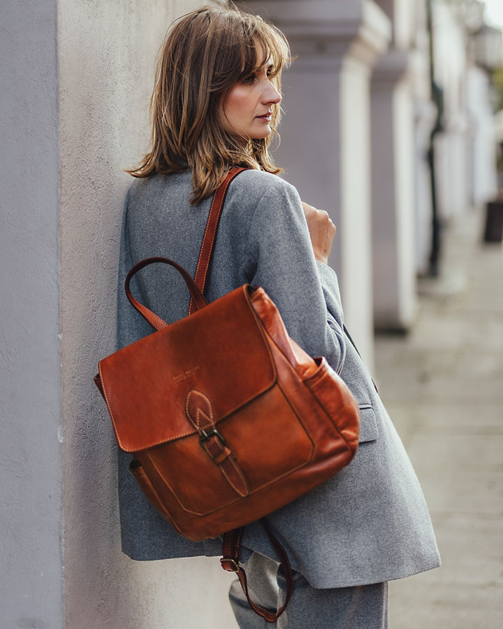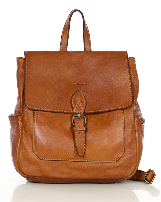 Plecak skórzany damski Marco Mazzini w kolorze brązowym to propozycja dla kobiet, które cenią sobie jakość i styl. Wykonanie z z naturalnej skóry licowej, bydlęcej, o gładkiej powierzchni gwarantuje, że plecak posłuży Ci przez wiele lat. Skóra tego typu charakteryzuje się tym, że jest trwała, miękka i aksamitna w dotyku. Plecak damski miejski jest ręcznie szyty, a następnie w całości farbowany, starzony i uszlachetniany. Procesy te gwarantują długowieczny efekt skóry naturalnej oraz aksamitność w dotyku. Skóra użyta do produkcji jest odporna na obciążenia i niepowtarzalna z wyglądu.