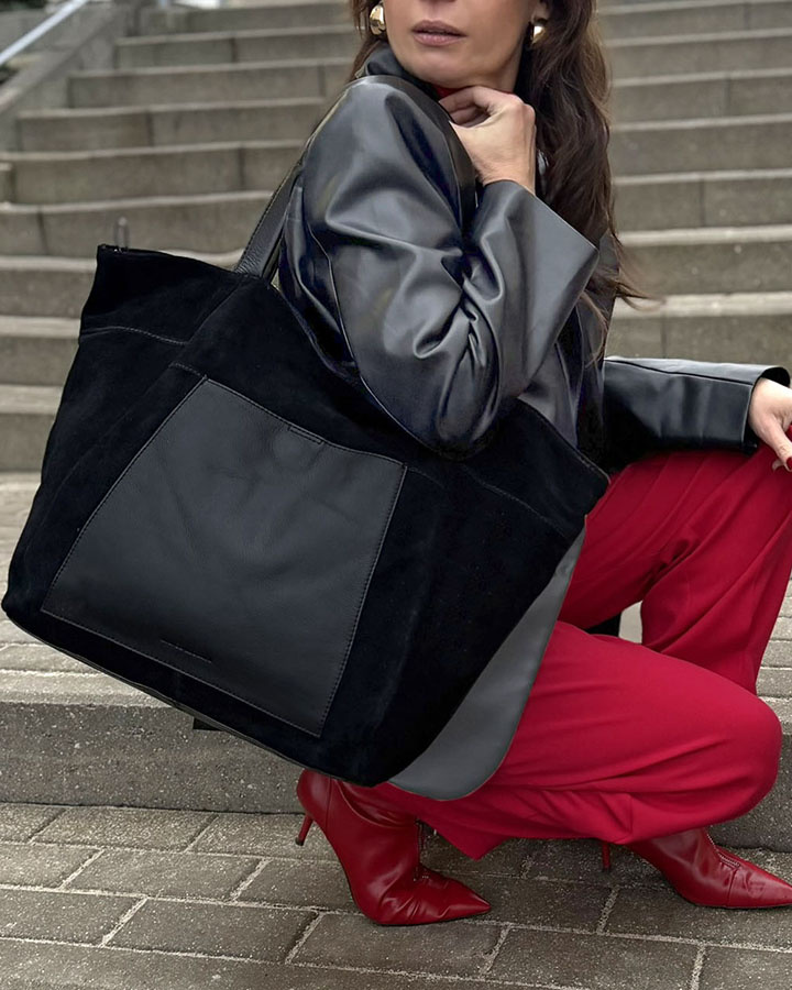 Duży rozmiar naszej zamszowej torebki sprawia, że jest idealna zarówno do pracy, jak i na zakupy. Może pomieścić laptop, dokumenty A4 oraz inne niezbędne rzeczy, co czyni ją niezastąpioną w codziennym użytkowaniu. Jej uniwersalność sprawia, że jest odpowiednia dla aktywnych kobiet. Ta duża torebka shopper pomieścić wiele przedmiotów, takich jak książki, kosmetyczka, czy strój na siłownię.