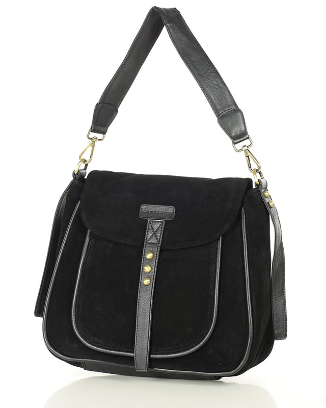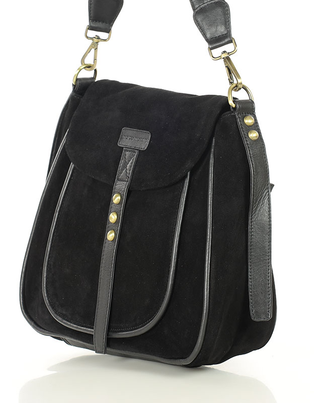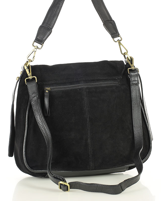 W środku tej czarnej zamszowej torebki na ramię znajduje się kieszonka na zamek oraz dwie otwarte przegródki. Dodatkowe kieszenie ukryte są pod klapą oraz z tyłu modelu, co ułatwia organizację drobiazgów. Wnętrze wykończone jest bawełnianą podszewką. Dzięki średniej wielkości mieszczącej format A4 to idealna torebka do pracy i na co dzień.