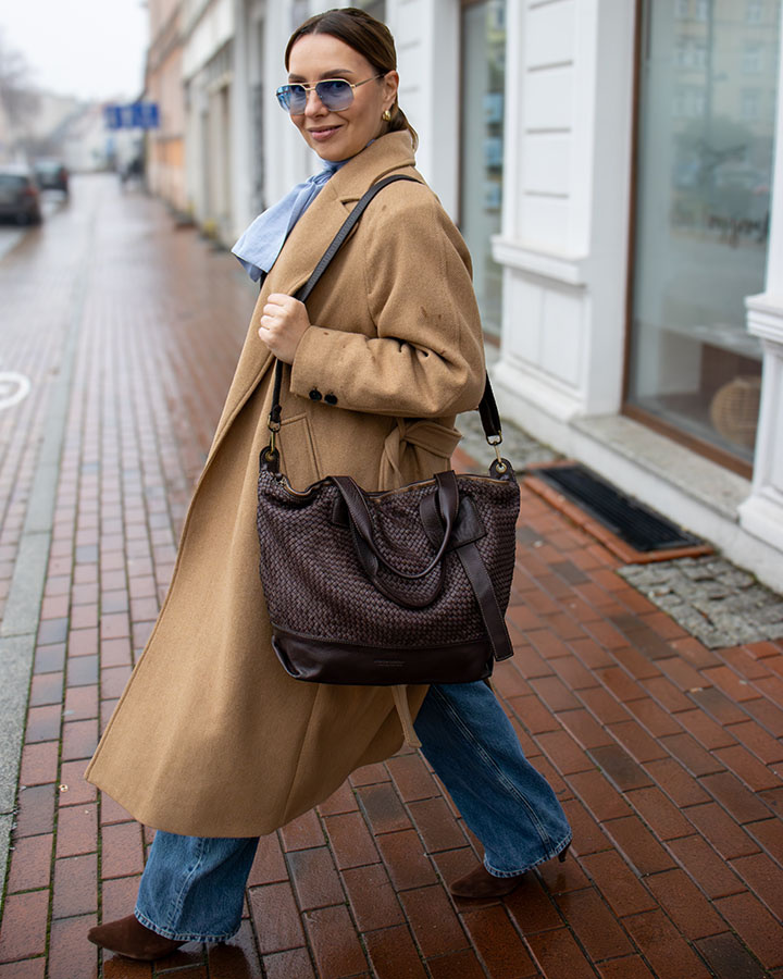 Ten model torebki łączy ponadczasowy design z funkcjonalnością. Pojemne wnętrze mieści dokumenty w formacie A4, laptopa, kosmetyczkę i inne niezbędne akcesoria, dzięki czemu ta camelowa skórzana torba doskonale sprawdzi się zarówno do biura, jak i na co dzień. Pleciona struktura nie tylko dodaje uroku, ale również zwiększa trwałość skóry, zapewniając wyjątkową odporność na zarysowania i intensywne użytkowanie.