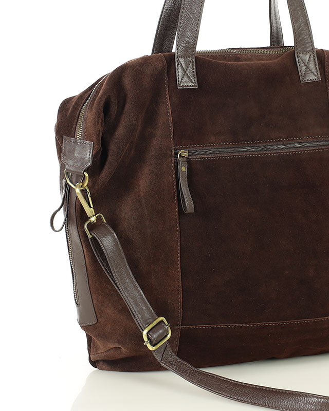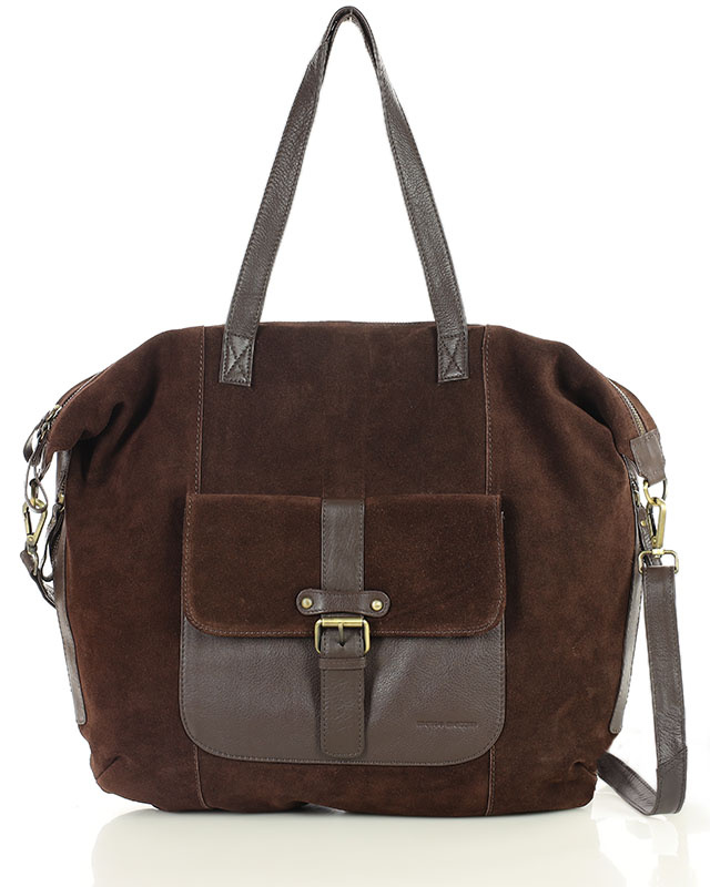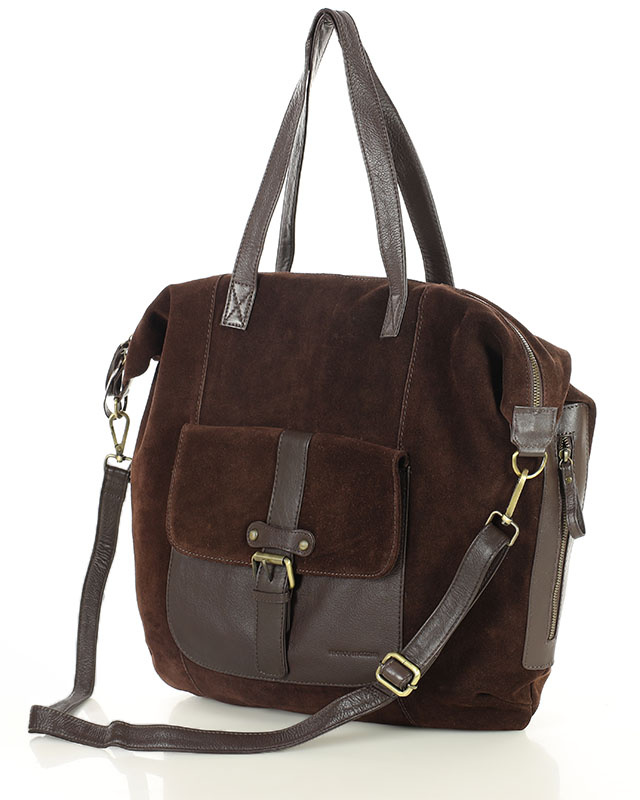 Duża ciemnobrązowa shopperka zamszowa z kieszenią - Funkcjonalność w rozmairze XL
