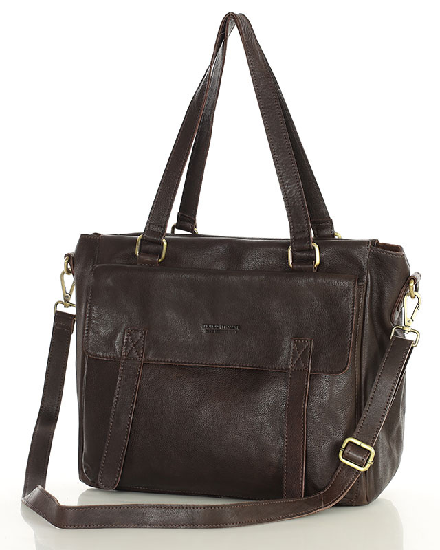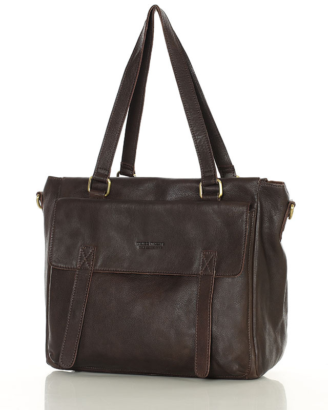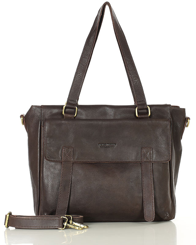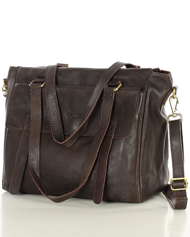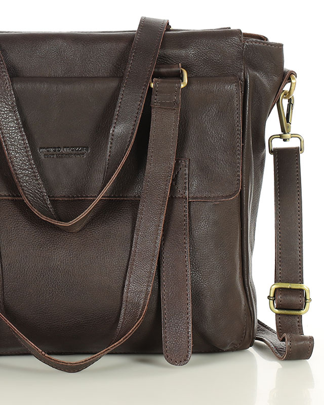 Ciemnobrązowy shopper skórzany z funkcjonalnymi kieszeniami